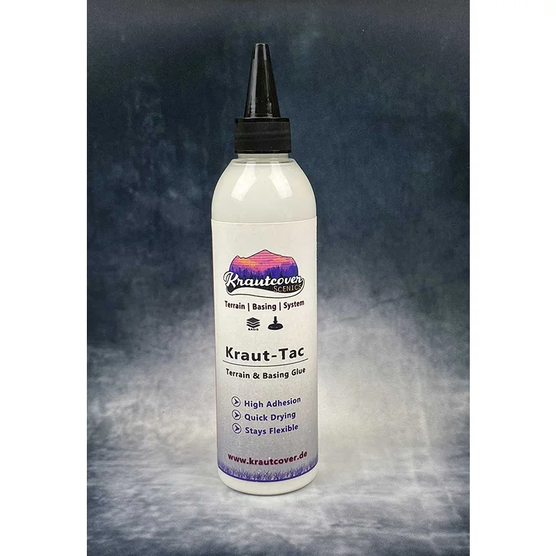 Terrain and Basing Glue is a fast drying extremely strong hobby glue with high initial tack. The highly flexible adhesive film remains permanently tacky even after drying and can later be set with clear varnish or diluted PVA glue. It is the first choice when it comes to fixing our base covers to your bases, but is also versatile for all your crafting projects. From making your own rollable playmats, to assembling MDF terrain to grassing or tufting, Kraut-Tac holds everything in place without flaking or crumbling. Allowing small drops of Kraut-Tac to dry on a sheet of plastic makes a very versatile adhesive dough, with which you can temporarily fix parts to minis, or create self-adhesive holders for painting your figures. No matter what you will call your Kraut-Tac later: Don`t call it wood glue!